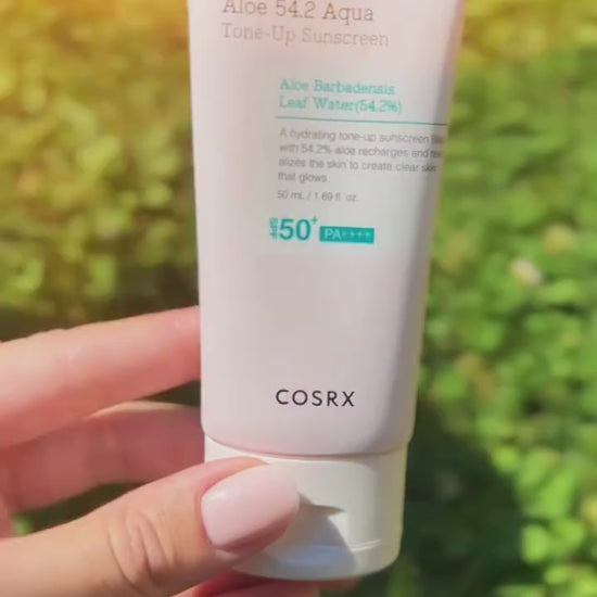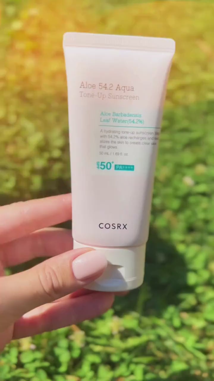 COSRX Aloe 54.2 Aqua Tone-Up Sunscreen SPF 50+ PA++++ provides high sun protection while hydrating and brightening the skin. Formulated with 54.2% Aloe Vera Leaf Water, it soothes and moisturizes, leaving your complexion fresh, radiant, and naturally glowing.
